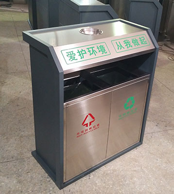 鋼制物業分類垃圾桶頂部煙灰缸設計,清潔環保,簡約而不簡單;雙桶分類,后背開門設計。