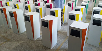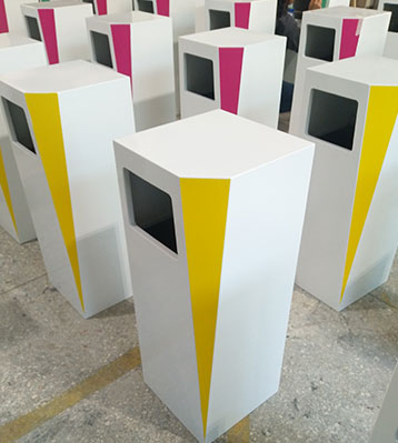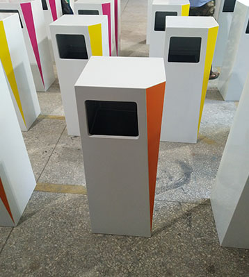 欣方圳商場室內鋼制垃圾桶經裁剪——折彎——氬弧焊焊接成型,再經酸洗磷化——靜電噴塑;確保桶體的戶外防銹能力和抗腐蝕性能;。