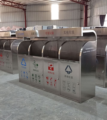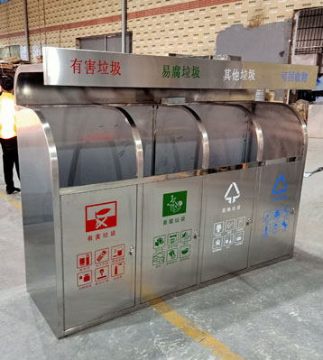 小區垃圾分類站點四類垃圾分類垃圾桶,不銹鋼無疑是較為理想的材質。它戶外防銹蝕效果好,表面金屬光澤高檔美觀,污漬也易清理。不銹鋼分類桶產...