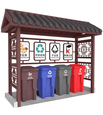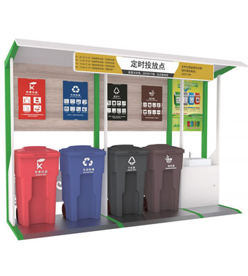 設有擋雨棚,可配備垃圾箱信息顯示屏、防水照明燈、廣告屏,進行地面硬化。對社區玻金塑紙可回收物,其他垃圾,廚余垃圾,有害垃圾等生活垃圾定時定點投放收集.