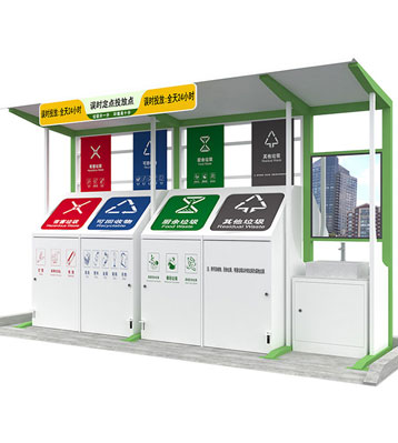 設(shè)有擋雨棚,可配備垃圾箱信息顯示屏、防水照明燈、廣告屏,進(jìn)行地面硬化。對社區(qū)玻金塑紙可回收物,其他垃圾,廚余垃圾,有害垃圾等生活垃圾定時(shí)定點(diǎn)投放收集.
