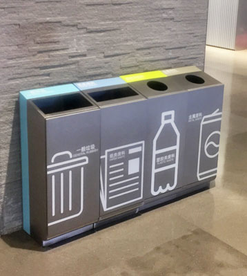 不銹鋼材質表面做烤漆效果,防銹蝕效果升級,金屬、塑料、紙張3分類可回收物和其他垃圾4分類果皮箱組合,商場購物中心擺放高檔美觀。