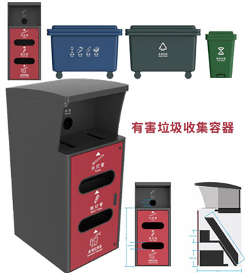 由有害垃圾、玻璃、金塑紙、廚余、其他垃圾收集容器組成.有害垃圾收集容器配外罩不配內桶,其余收集容器由外罩和120/240/660L內桶組成。
